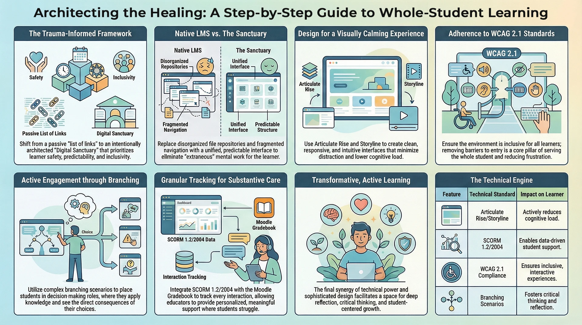Agape Learning Design transforms standard Learning Management Systems into environments of care. We leverage research-based adult learning theory, Moodle 5.x, Articulate 360, and carefully vetted AI Tools to reduce cognitive load, prioritize student safety, and facilitate spiritual reflection.
